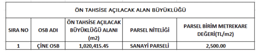 Organize Sanayi Bölgeleri Uygulama Yönetmeliğinin “Ön Tahsis” başlıklı 54/A maddesi kapsamında ön tahsis yapılacak alana ilişkin bilgiler aşağıda yer almaktadır.