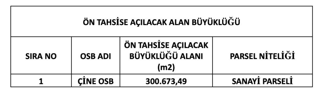 Organize Sanayi Bölgeleri Uygulama Yönetmeliğinin “Ön Tahsis” başlıklı 54/A maddesi kapsamında ön tahsis yapılacak alana ilişkin bilgiler aşağıda yer almaktadır.