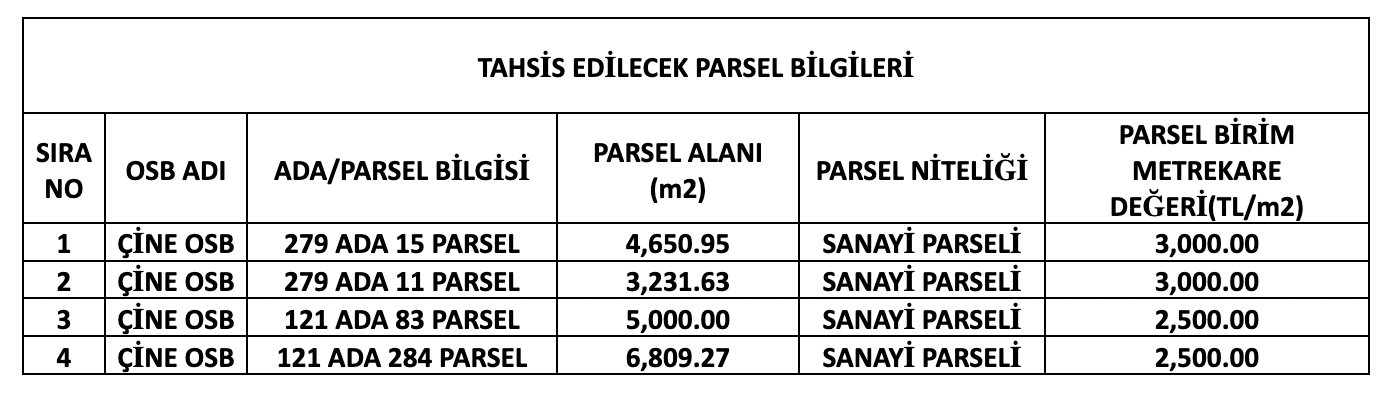 • Boş parsellere ilişkin harita bilgilerine MEYDİP sistemi üzerinden ulaşabileceği gibi Arsa tahsis yapılacak alanlara ilişkin bilgiler aşağıdaki tabloda yer almaktadır.