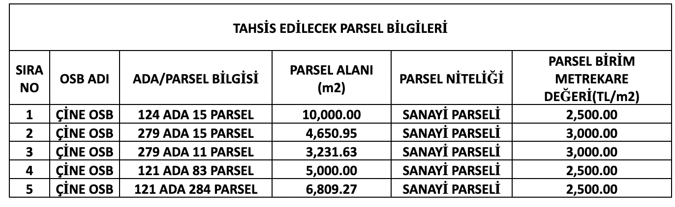 - Boş parsellere ilişkin harita bilgilerine MEYDİP sistemi üzerinden ulaşabileceği gibi Arsa tahsis yapılacak alanlara ilişkin bilgiler aşağıdaki tabloda yer almaktadır.