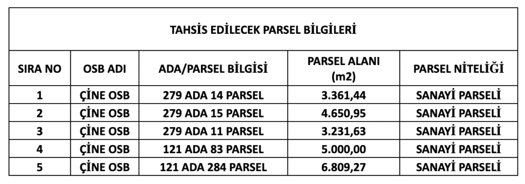 • Boş parsellere ilişkin harita bilgilerine MEYDİP sistemi üzerinden ulaşabileceği gibi Arsa tahsis yapılacak alanlara ilişkin bilgiler aşağıdaki tabloda yer almaktadır.
