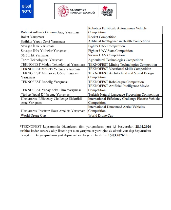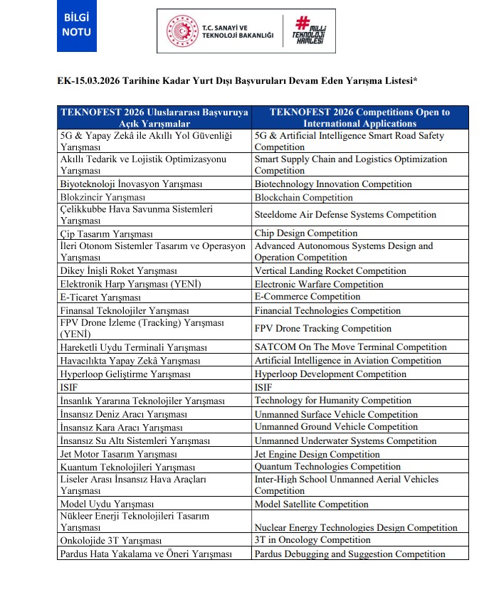 TEKNOFEST 2026 ve başvuruları devam eden teknoloji yarışmalarına ilişkin detaylı bilgiye aşağıdaki bağlantıdan ulaşabilirsiniz: