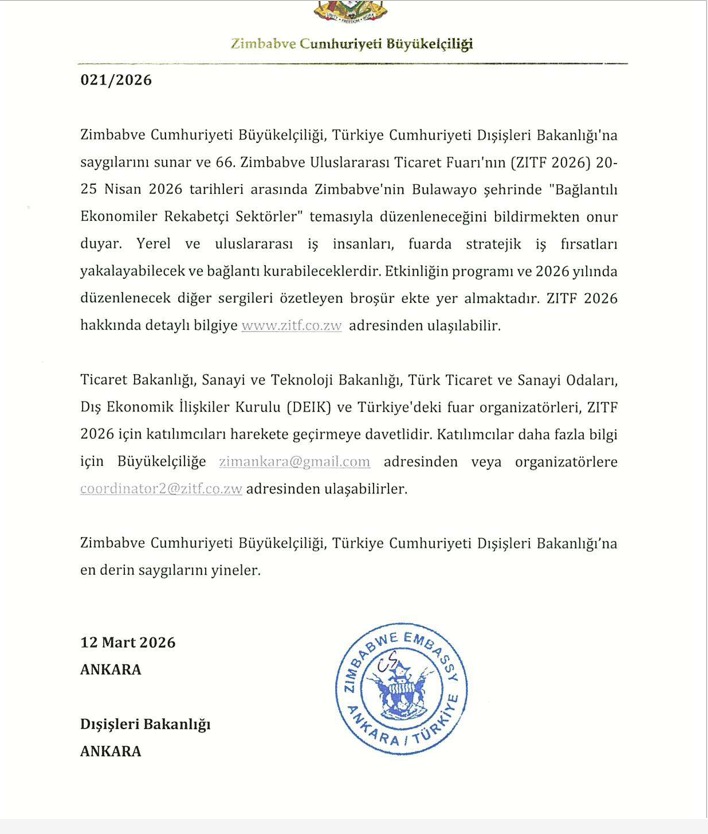 “Bağlantılı Ekonomiler, Rekabetçi Sektörler (Connected Economies Competitive Industries)” temasıyla düzenlenecek olan Zimbabve 66. Uluslararası Ticaret Fuarı’nın (ZIFT 2026), Zimbabve’nin Bulawayo şehrinde gerçekleştirileceği bildirilmiştir.